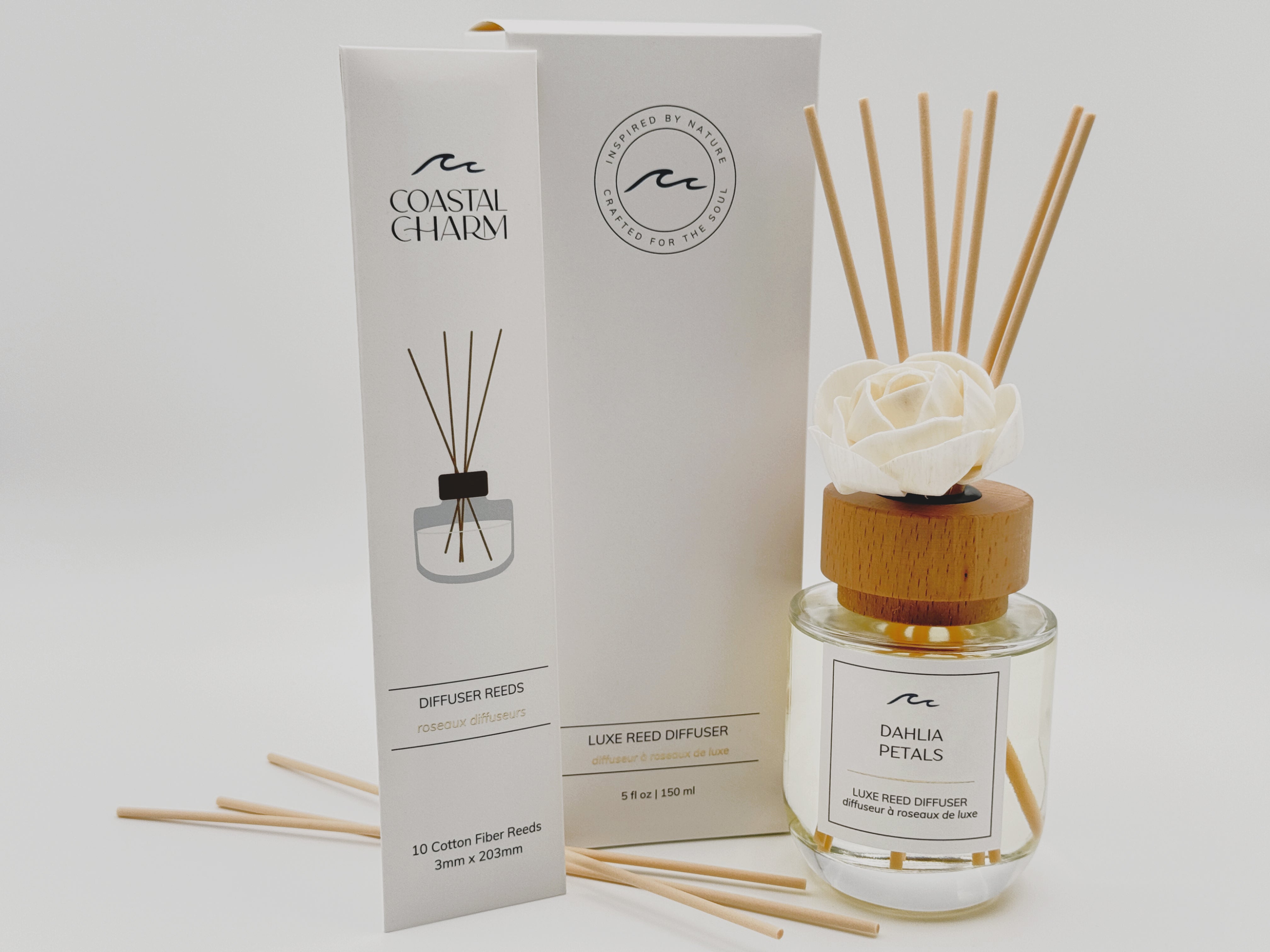 Enjoy continuous fragrance without the flame! Our Luxe Reed Diffusers feature an all-natural base, 100% cotton fiber reeds, and premium fragrance & essential oils to fill your home with signature Coastal Charm scents, all day, every day.